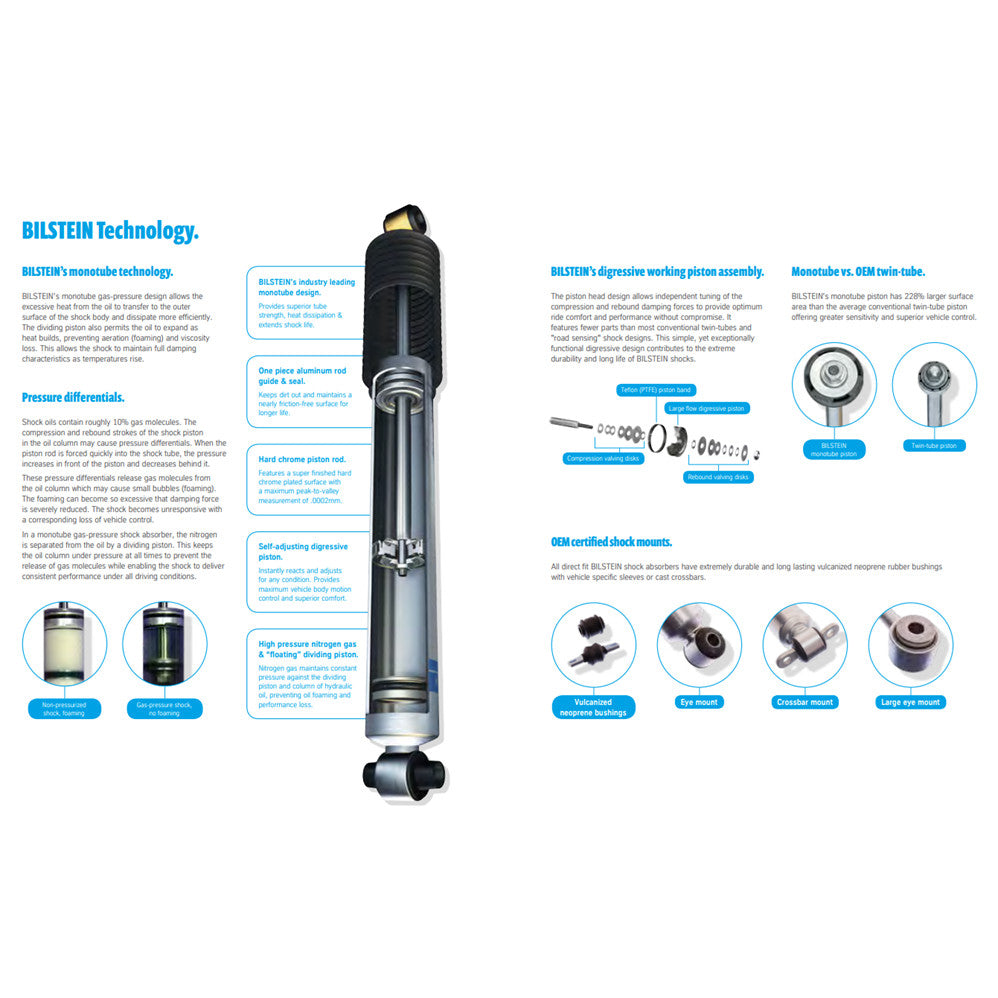 Bilstein B6 shock absorbers and struts are the ideal choice for improving the performance of any vehicle. These shock absorbers and struts feature a monotube design which provides consistent fade free performance. Bilstein B6 shock absorbers and struts utilize a unique, velocity sensitive, digressive piston which reacts to changing road conditions to provide consistent fade free performance. All B6 shock absorbers and struts are tuned for each specific application to assure optimal performance is achieved. Bilstein B6 shock absorbers and struts offer a significant improvement in ride quality, handling, and comfort.